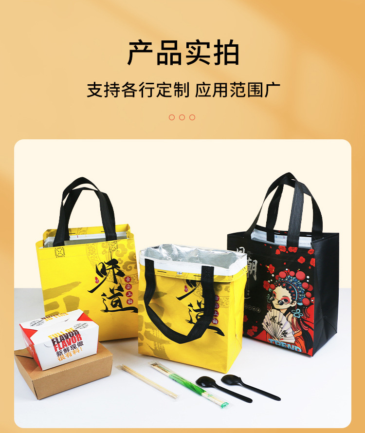 • 环保性:无纺布覆膜外卖袋是一种环保产品,客户在选择材质和设计时,应考虑到环保因素,尽可能选择可回收、可降解的材料。